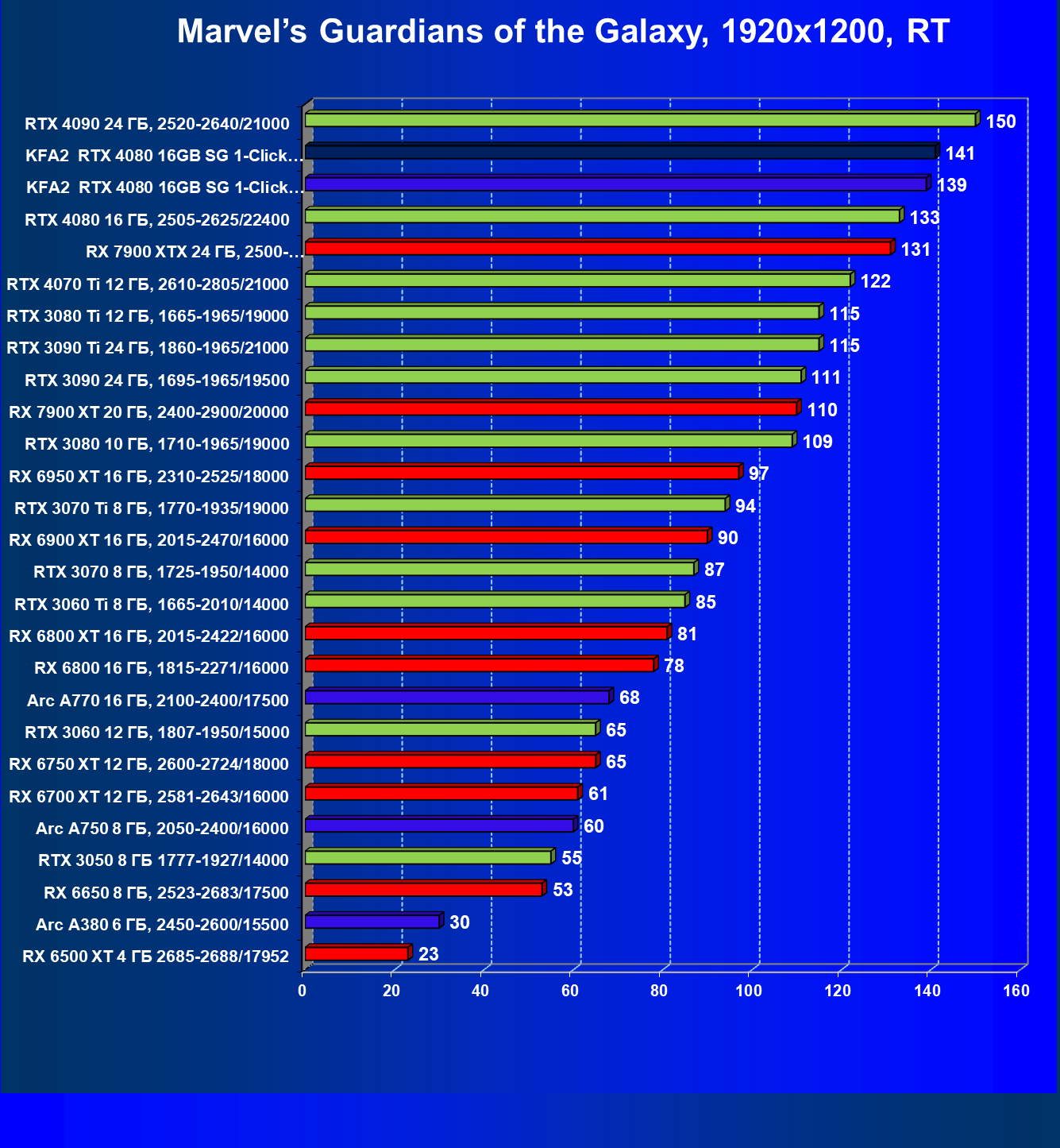 | 26 | RX 6950 XT 16 ГБ, 2310—2525/18000 | 112 | 892 | 80 000 |