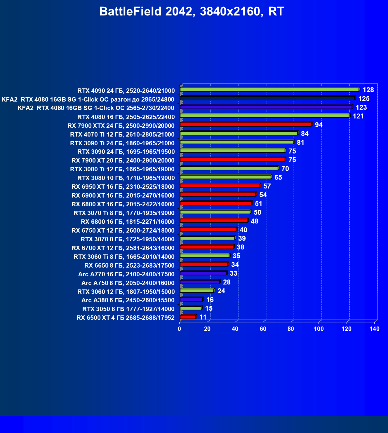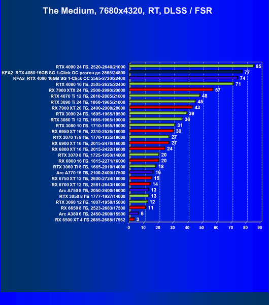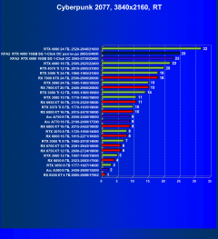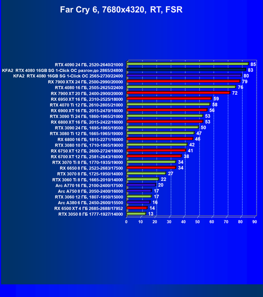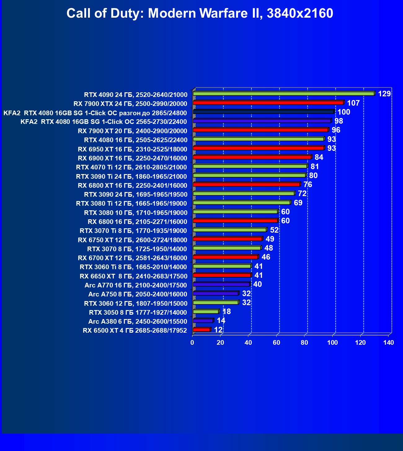 | 23 | RX 6950 XT 16 ГБ, 2310—2525/18000 | 80 | 644 | 80 000 |
