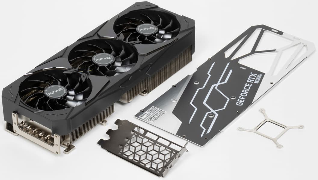 E обозреваемой карты KFA2 мы видим кулер, выполненный по концепции сквозного продува хвостовой части радиатора. Основой СО является огромный многосекционный пластинчатый никелированный радиатор с тепловыми трубками, распределяющими тепло по ребрам радиатора.
