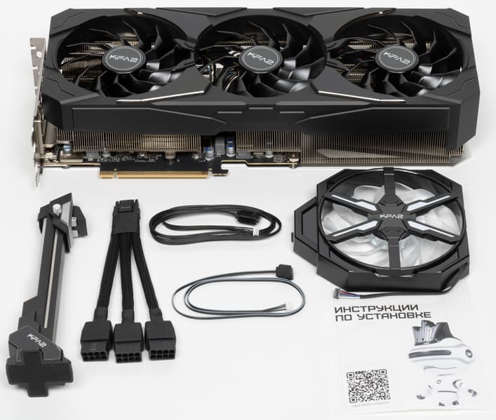 В комплекте поставки кроме традиционного краткого руководства пользователя имеются два провода для синхронизации подсветки с материнской платой и/или подставкой, оснащенная подсветкой подставка-штатив под карту, адаптер питания и дополнительный вентилятор.
