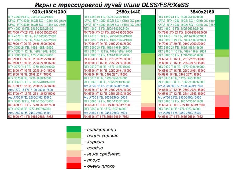 Трассировка лучей в целом снижает производительность, но у семейства GeForce RTX падение наименьшее, а у Radeon RX 6xxx – наибольшее, RX 7xxx – где-то посредине. При этом мы знаем, что все больше и больше игр выходит с поддержкой Nvidia DLSS, AMD FSR и Intel XeSS. Все эти технологии «умного» сглаживания позволяют поднять производительность, в том числе компенсируя падение от включения рейтрейсинга, при этом наиболее продвинутая технология DLSS поднимает иногда производительность даже выше уровня, который выдают карты семейства RTX без трассировки лучей (в играх с использованием DLSS 3,0 можно будет вообще про отключения трассировки лучей).
