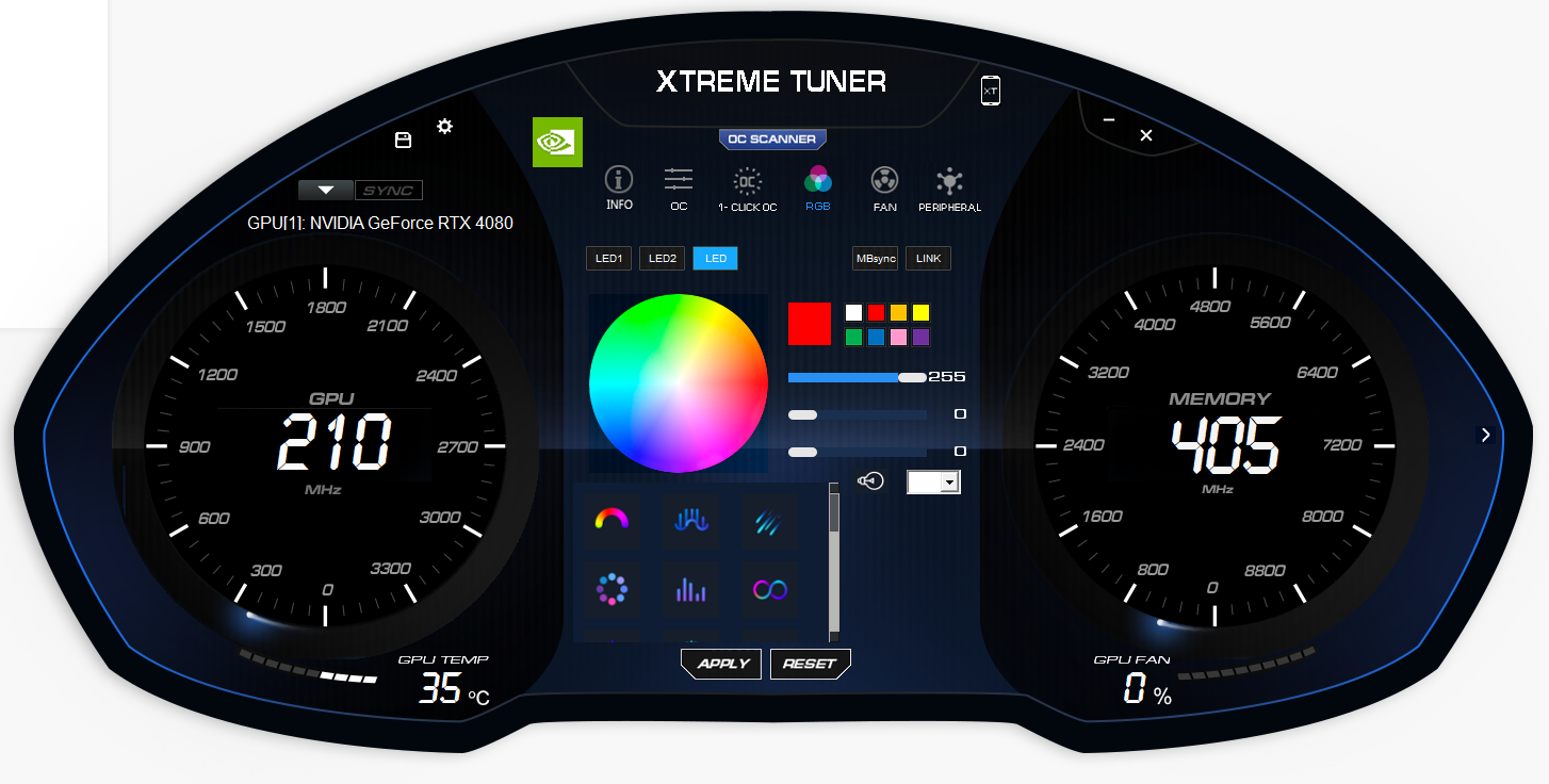 ARGB подсветка регулируется с помощью той же утилиты Xtreme Tuner Plus, также мы можем синхронизировать подсветку с системной платой с помощью 5V ARGB-разъема на ней и кабеля идущего в комплекте поставки данной карты. Дополнительными источниками свечения являются подставка под карту, также поставляемая с ней, ну и четвертый вентилятор.