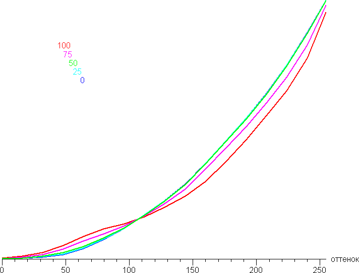 Реальная гамма-кривая зависит от выбранного профиля в списке Гамма (значения показателей аппроксимирующей функции приведены в скобках в подписях, там же — коэффициент детерминации):