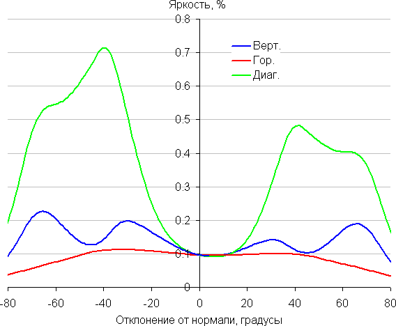 Отметим плавное уменьшение яркости при отклонении от перпендикуляра к экрану в горизонтальном направлении, при этом графики не пересекаются во всем диапазоне измеряемых углов. Чуть быстрее падает яркость при отклонении в вертикальном направлении. При отклонении в диагональном направлении поведение яркости оттенков имеет промежуточный характер между вертикальным и горизонтальным направлениями, за исключением яркости черного поля, которая начинает резко возрастать уже при 20°-30° отклонения от перпендикуляра к экрану. Если сидеть от экрана на расстоянии 50-60 см, то черное поле по углам будет заметно светлее, чем в центре. Контрастность в диапазоне углов ±82° в случае отклонения по диагонали приближается к отметке 10:1, но не опускается ниже.