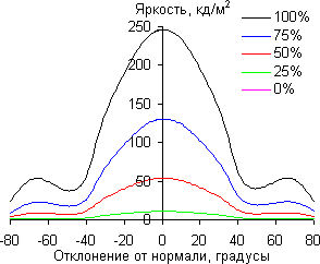 Отметим плавное уменьшение яркости при отклонении от перпендикуляра к экрану в горизонтальном направлении, при этом графики не пересекаются во всем диапазоне измеряемых углов. Заметно быстрее падает яркость при отклонении в вертикальном направлении. При отклонении в диагональном направлении поведение яркости оттенков имеет промежуточный характер между вертикальным и горизонтальным направлениями, за исключением яркости черного поля, которая начинает резко возрастать уже при 20°-30° отклонения от перпендикуляра к экрану. Если сидеть от экрана на расстоянии 50-60 см, то черное поле по углам будет заметно светлее, чем в центре. Контрастность в диапазоне углов ±82° в случае отклонения по диагонали приближается к отметке 10:1, но не опускается ниже.