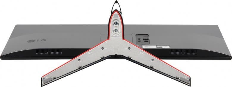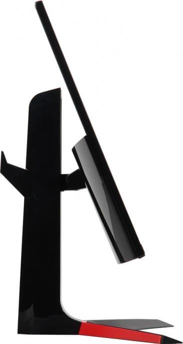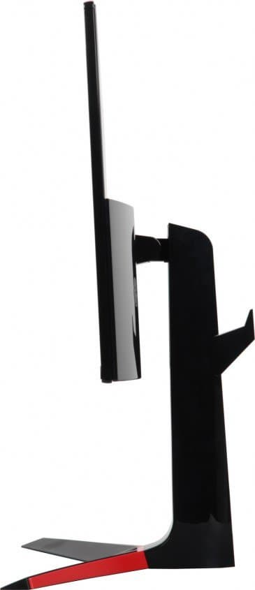 Подставка состоит из двух частей — из основания и стойки. Чтобы выдержать приличный вес монитора, основание и стойка изготовлены из алюминиевого сплава и стальных штампованных элементов, и только сверху прикрыты кожухами из пластика. На основании есть красная декоративная вставка из пластика. Кабели, идущие от разъемов монитора, можно прижать к стойке входящей в комплект поставки скобой из пластика. Также эта скобка может выступать в роли крюка для наушников.
