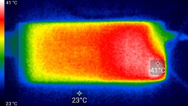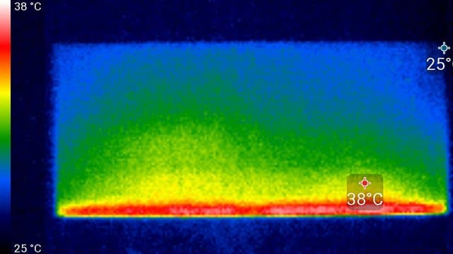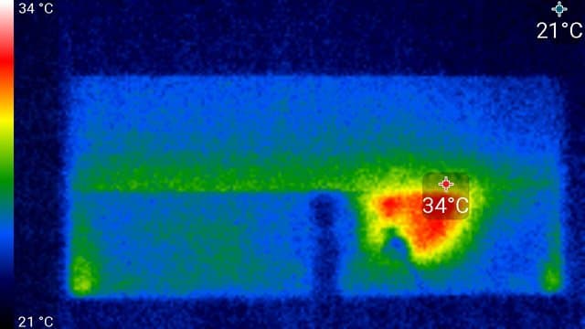 Задняя панель существенно греется только в одной области. Спереди в нижней части экрана была зафиксирована температура в 38 °C — видимо, там находится светодиодная линейка подсветки экрана. Корпус блока питания нагрелся до 41 °C максимум: