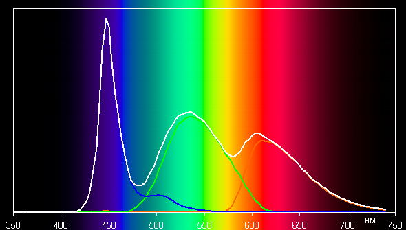 Такой спектр с относительно узким пиком синего и с широкими горбами зеленого и красного цветов характерен для мониторов, в которых используется светодиодная подсветка с синим излучателем и желтым люминофором.
