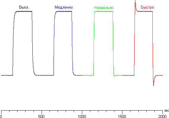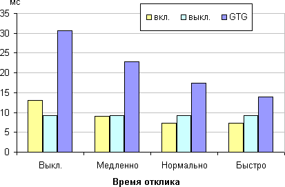 Время отклика зависит от значения одноименной настройки, которая управляет разгоном матрицы. Ступени регулировки четыре. График ниже показывает, как меняется время включения и выключения при переходе черный-белый-черный (столбики «вкл.» и «выкл.»), а также среднее суммарное время для переходов между полутонами (столбики GTG):