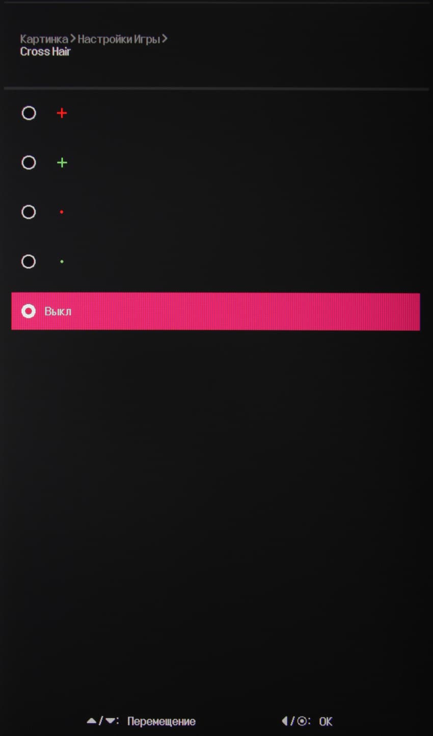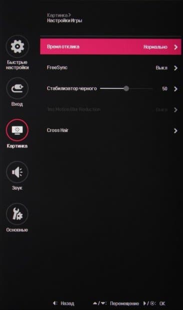 Отдельно вынесены игровые настройки — управление разгоном матрицы, включение/выключение AMD FreeSync, регулировка уровня черного, вставка черного кадра (1ms Motion Blur Reduction) и экранный прицел (Cross Hair).