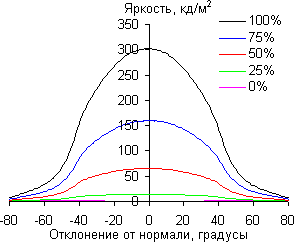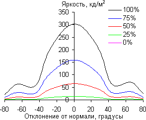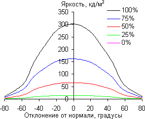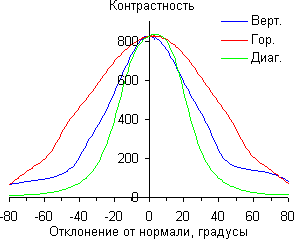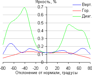 Отметим плавное уменьшение яркости при отклонении от перпендикуляра к экрану в горизонтальном направлении, при этом графики не пересекаются во всем диапазоне измеряемых углов. Заметно быстрее падает яркость при отклонении в вертикальном направлении. При отклонении в диагональном направлении поведение яркости оттенков имеет промежуточный характер между вертикальным и горизонтальным направлениями, за исключением яркости черного поля, которая начинает резко возрастать уже при 20°-30° отклонения от перпендикуляра к экрану. Если сидеть от экрана на расстоянии 50-60 см, то черное поле по углам будет заметно светлее, чем в центре. Контрастность в диапазоне углов ±82° в случае отклонения по диагонали приближается к отметке 10:1, но не опускается ниже.