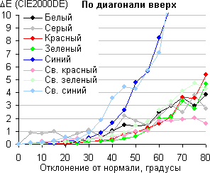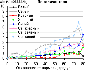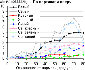 Для количественной характеристики изменения цветопередачи мы провели колориметрические измерения для белого, серого (127, 127, 127), красного, зеленого и синего, а также светло-красного, светло-зеленого и светло-синего полей во весь экран с использованием установки, подобной той, что применялась в предыдущем тесте. Измерения проводились в диапазоне углов от 0° (датчик направлен перпендикулярно к экрану) до 80° с шагом в 5°. Полученные значения интенсивностей были пересчитаны в ΔE относительно замера каждого поля при перпендикулярном положении датчика относительно экрана. Результаты представлены ниже: