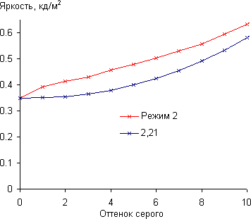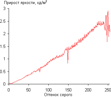 Реальная гамма-кривая ближе всего к стандартной при выборе Режим2, поэтому далее мы измерили яркость 256 оттенков серого (от 0, 0, 0 до 255, 255, 255) при этом значении. График ниже показывает прирост (не абсолютное значение!) яркости между соседними полутонами: