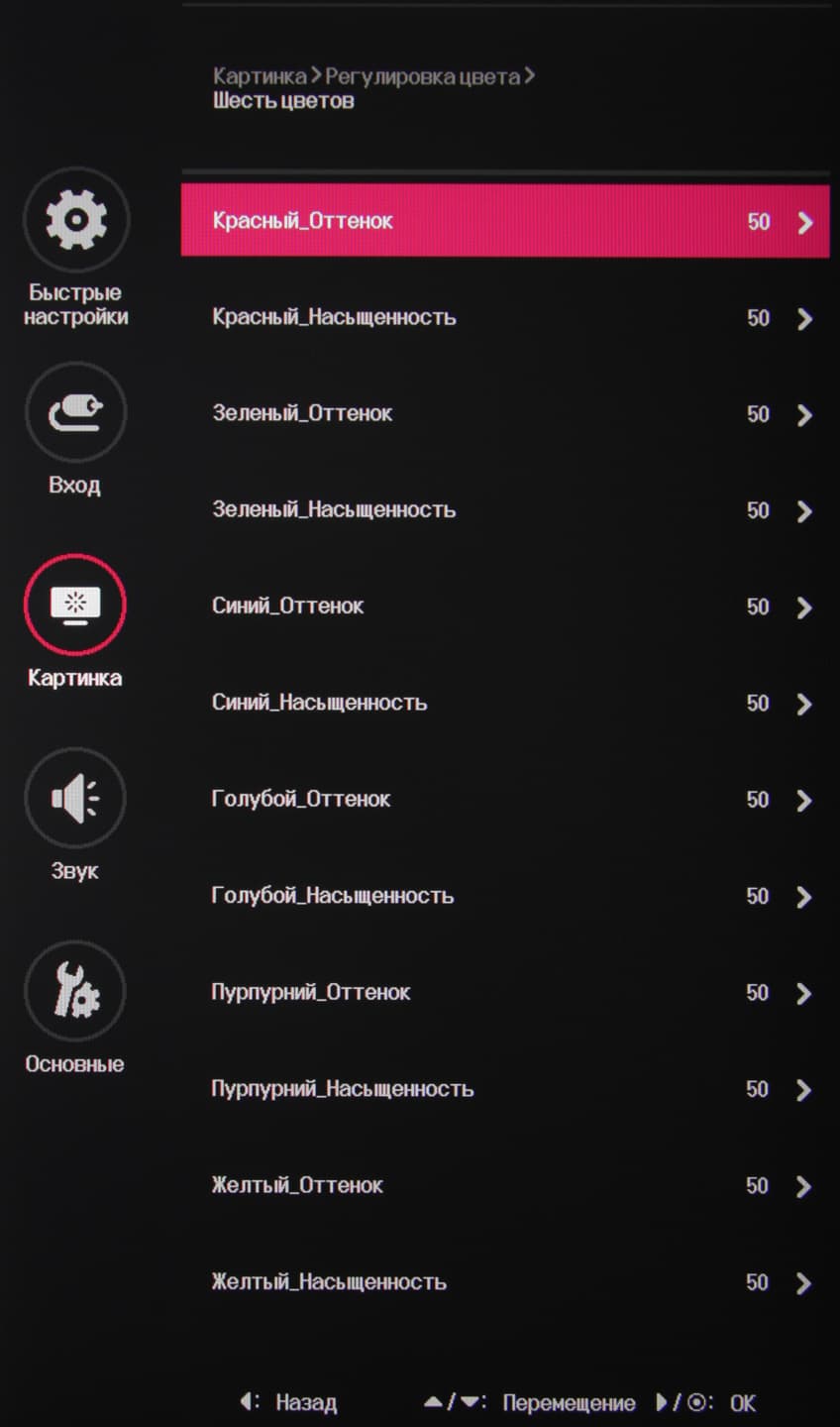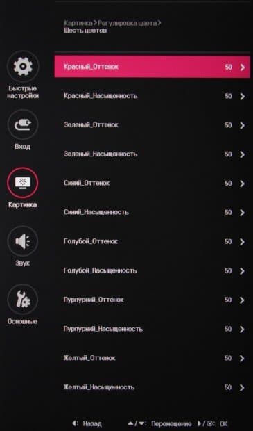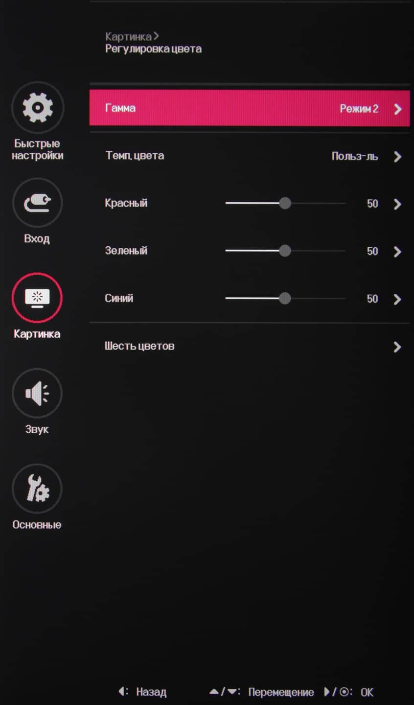 Присутствуют стандартные настройки Яркость, Контрастность и Четкость. Есть функция улучшения изображения с низким разрешением Super Resolution+. В списке выбирается профиль гамма-коррекции, а цветовой баланс корректируется выбором одного из трех профилей цветовой температуры или ручной регулировкой интенсивности трех цветов, а также оттенка и насыщенности шести цветов.