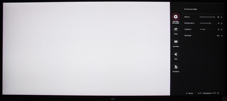 Длительное нажатие всегда выключает монитор. Из стартового меню можно выйти, перейти к выбору входа, к началу основного меню, в игровое меню, или выключить монитор. Далее при навигации по меню в нижней его части выводятся подсказка по текущим функциям джойстика. Меню занимает на экране примерно ¼ часть площади вертикальной полосой в правой части, что, конечно, мешает оценке вносимых изменений.