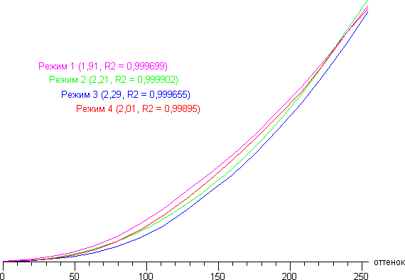 Реальная гамма-кривая зависит от выбранного профиля в списке Гамма (значения показателей аппроксимирующей функции приведены в скобках в подписях, там же — коэффициент детерминации):