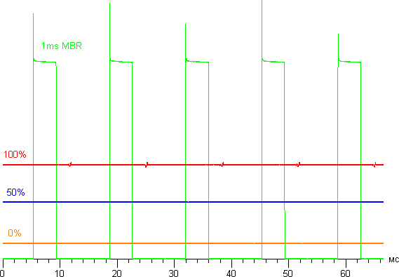 Яркость монитора меняется именно яркостью подсветки, то есть без ущерба для качества изображения (сохраняется контрастность и количество различимых градаций) яркость монитора можно менять в достаточно широких пределах, что позволяет с комфортом работать и смотреть фильмы как в освещенном, так и в темном помещении. На любом уровне яркости значимая модуляция подсветки отсутствует, поэтому нет и никакого мерцания экрана. В доказательство приведем графики зависимости яркости (вертикальная ось) от времени (горизонтальная ось) при различных значениях настройки яркости: