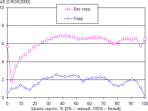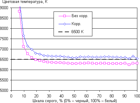 Мы попытались вручную скорректировать цветовой баланс, регулируя усиление трех основных цветов. Графики ниже показывают цветовую температуру на различных участках шкалы серого и отклонение от спектра абсолютно черного тела (параметр ΔE) без вмешательства и после ручной коррекции: