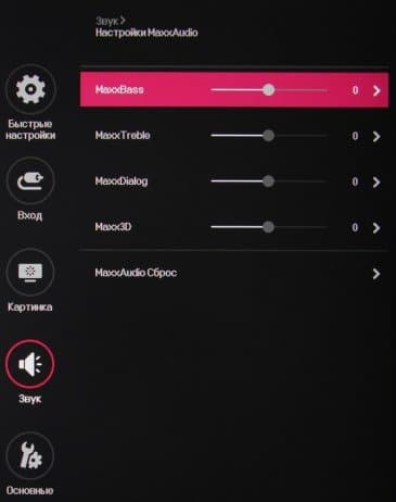 Монитор оснащен тремя цифровыми входами: DisplayPort в полноразмерном варианте, HDMI версии 1.4 и интерфейс USB 3.1 Тип C. Последний вход используется как видеовход в режиме DisplayPort Alt Mode. Функции автоматического поиска сигнала на входах нет, но во время подключения к одному источнику при обнаружении сигнала на другом входе монитор выводит сообщение с предложением переключиться на появившийся источник. Видеовходы способны также принимать цифровые аудиосигналы, которые выводятся после преобразования в аналоговый вид через гнездо миниджек 3,5 мм или на встроенные громкоговорители. К этому гнезду можно подключить внешнюю активную акустическую систему или наушники. Мощности выхода хватило, чтобы в 32-омных наушниках с чувствительностью 112 дБ был огромный запас по громкости. Качество звука в наушниках в принципе неплохое — звук чистый, в паузах шума не слышно, — но низких частот маловато. Встроенные громкоговорители звучат для их класса очень даже прилично. Для пользователя перед экраном — достаточно громко, есть какие-то признаки наличия низких частот и нет выраженных перегрузок даже на максимальной громкости, стереофонический эффект чувствуется. Неизбежный «пластиковый» призвук из-за паразитных резонансов корпуса присутствует, что, разумеется, несколько снижает общее качество звука. В мониторе реализован продвинутый набор функций MaxxAudio, корректирующих звук.