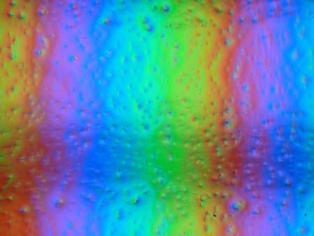 Зерно этих дефектов в несколько раз меньше размеров субпикселей (масштаб этих двух фотографий одинаковый), поэтому фокусировка на микродефектах и «перескок» фокуса по субпикселям при изменении угла зрения выражены слабо, из-за этого нет и «кристаллического» эффекта.