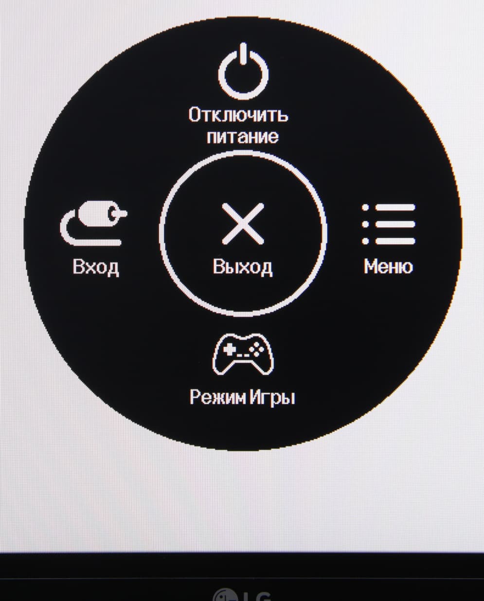 Джойстик при работе неярко подсвечивается белым (отключается в меню), редко мигает белым в режиме ожидания и не горит, если монитор условно выключен. Когда на экране нет меню, то отклонение джойстика влево или вправо выводит ползунок громкости, а вверх или вниз — информацию о текущем входе. Короткое нажатие выводит стартовое круглое меню.