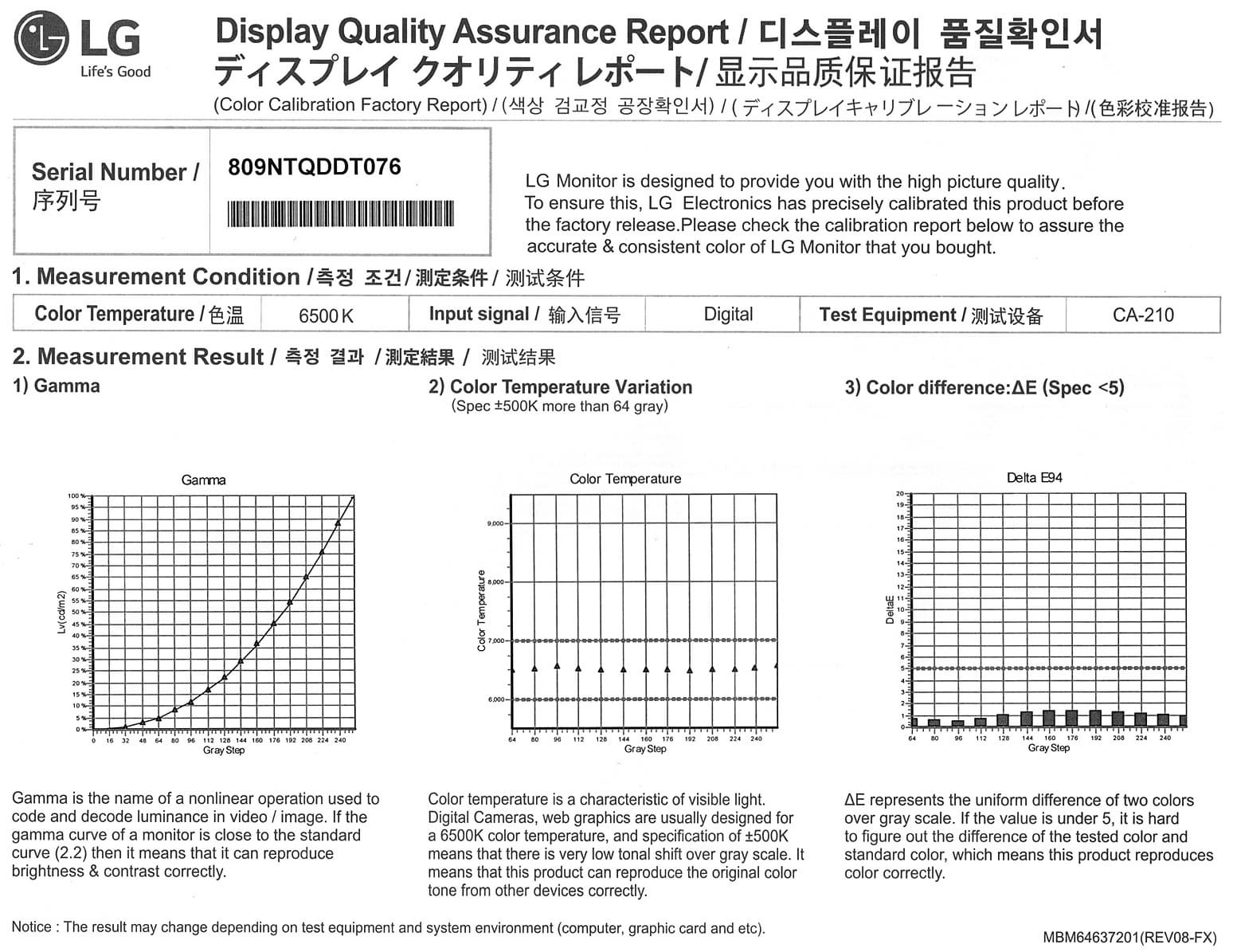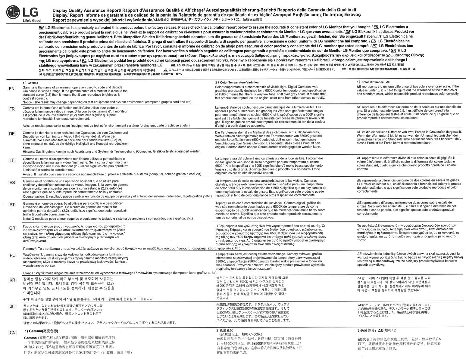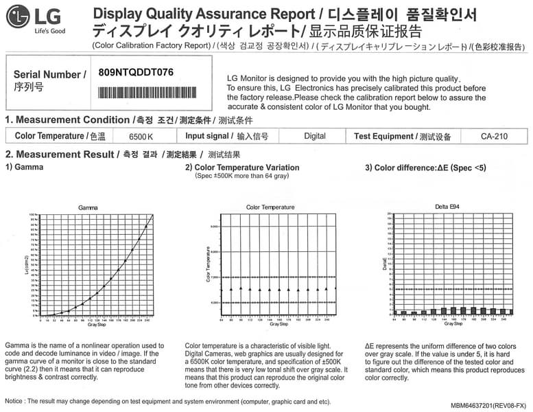 К каждому монитору прилагается отчет о выполненной на заводе калибровке: