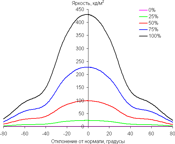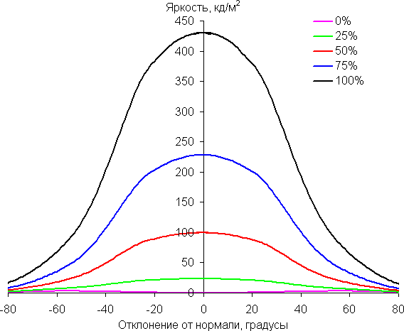 В качестве реперной точки можно выбрать отклонение в 45°, что может быть актуальным в случае, например, если изображение на экране рассматривают два человека одновременно. Критерием сохранения правильности цветов можно считать значение ΔE меньше 3. Стабильность цветов хорошая, это является одним из главных достоинств матрицы типа IPS, хотя, стоит отметить, что встречаются IPS-матрицы, у которых стабильность цветов еще выше.