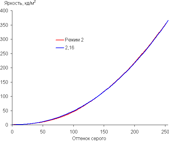 Аппроксимация (уже по 256 точкам) полученной гамма-кривой дала показатель 2,16, что немного ниже стандартного значения 2,2, при этом реальная гамма-кривая чуть-чуть отклоняется от аппроксимирующей степенной функции: