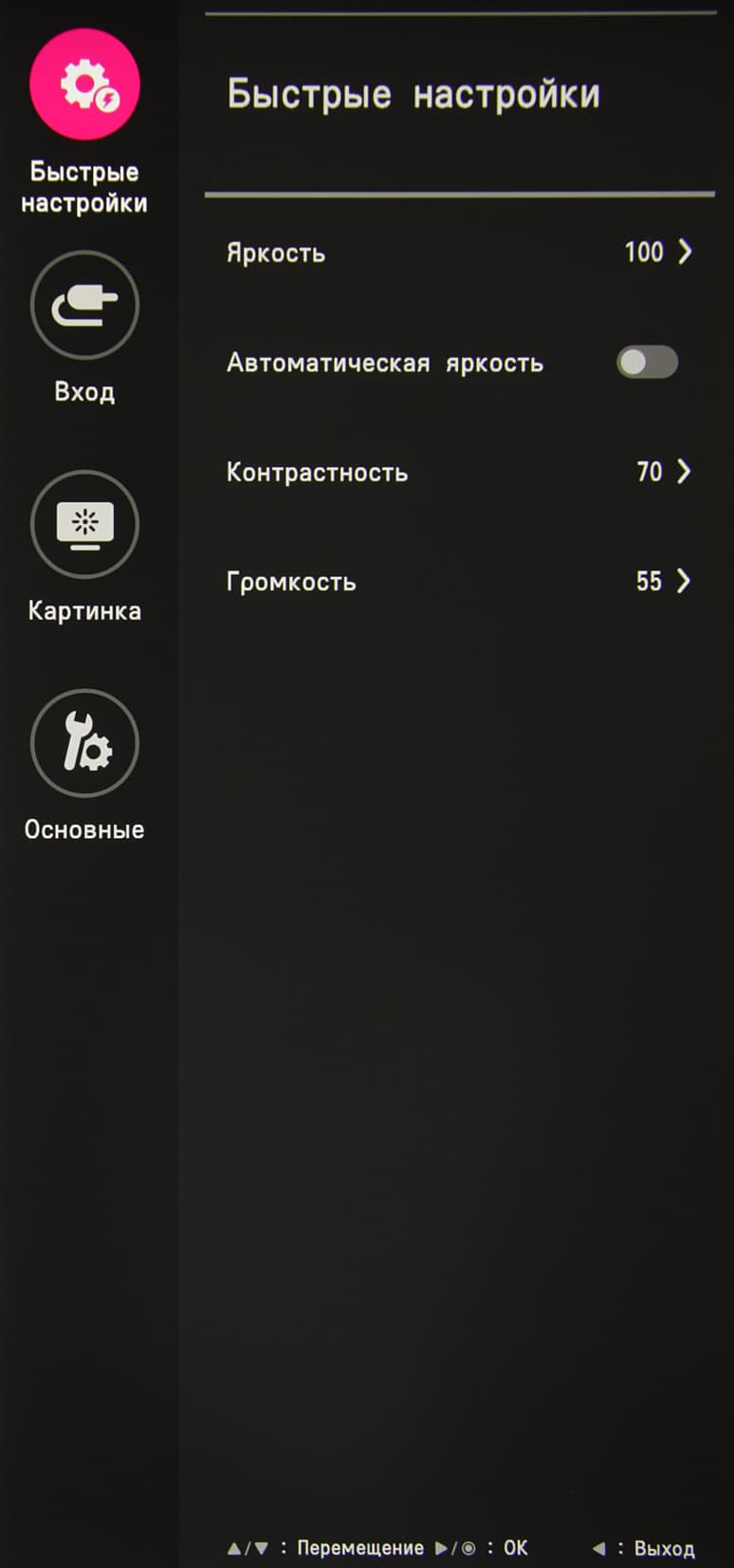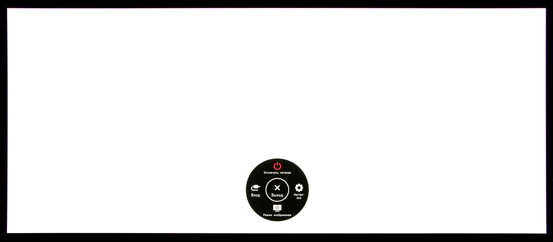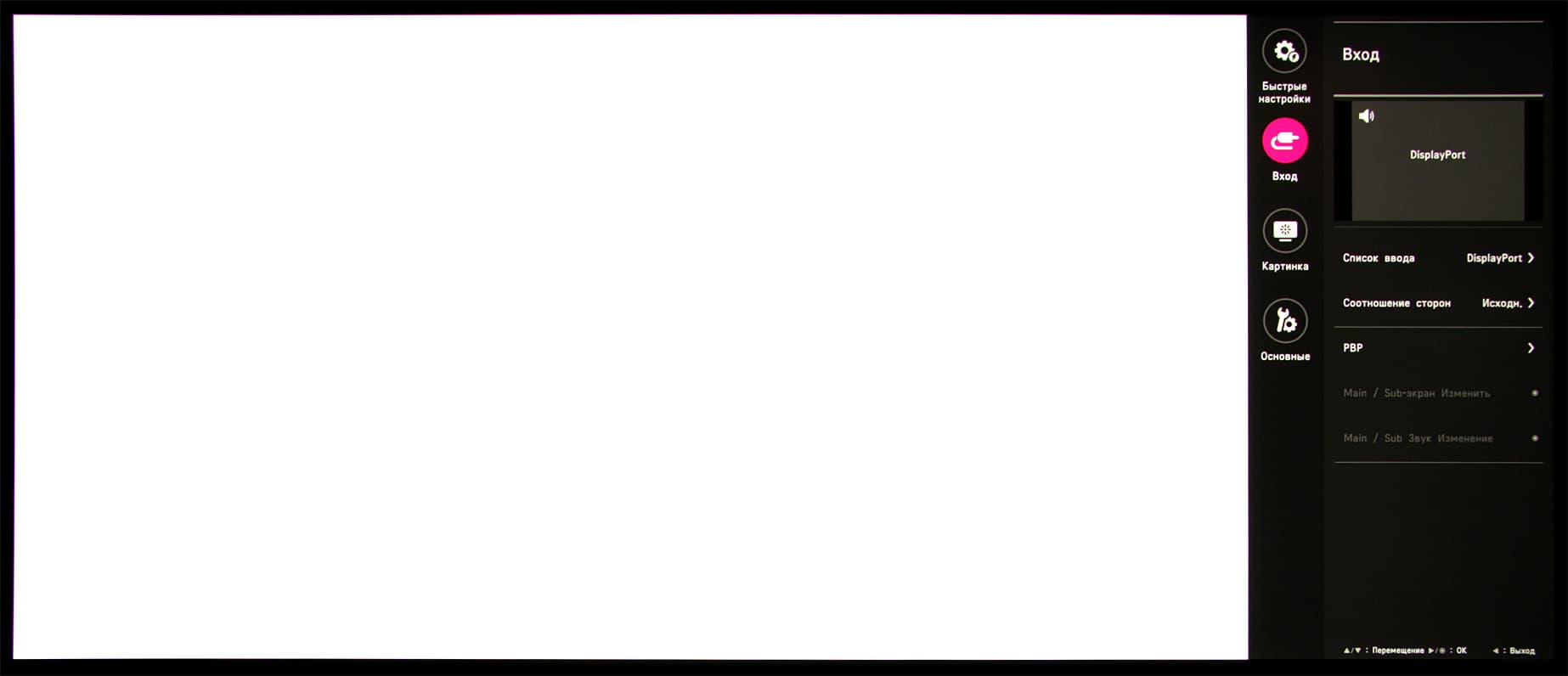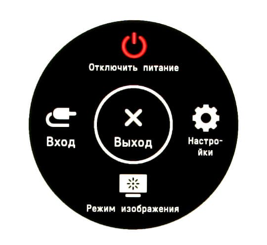 Длительное нажатие, когда нет меню, выключает монитор. При включении монитора раздается звуковой сигнал (его можно отключить в настройках). Из стартового меню можно выйти, перейти к выбору входа, к основному меню, в список выбора режима (профиля изображения), или выключить монитор. Далее при навигации по меню в нижней его части выводится подсказка по текущим функциям джойстика. Меню занимает на экране примерно 1/5 часть площади вертикальной полосой в правой части, что, конечно, иногда мешает оценке вносимых изменений.