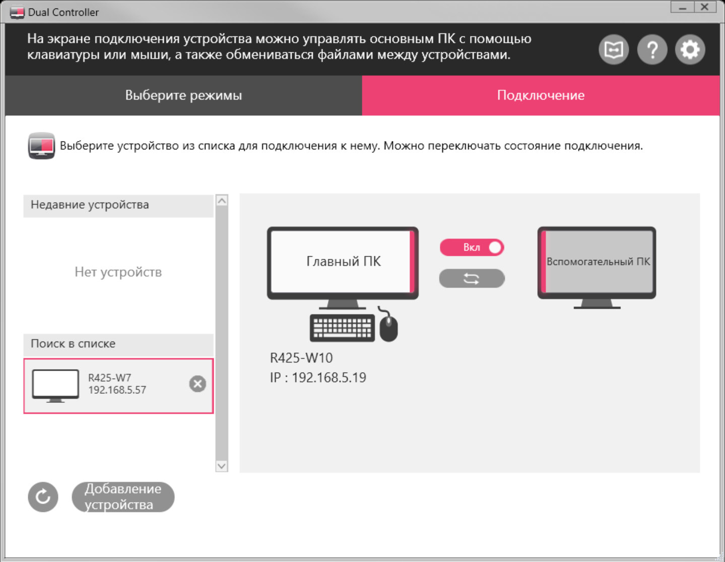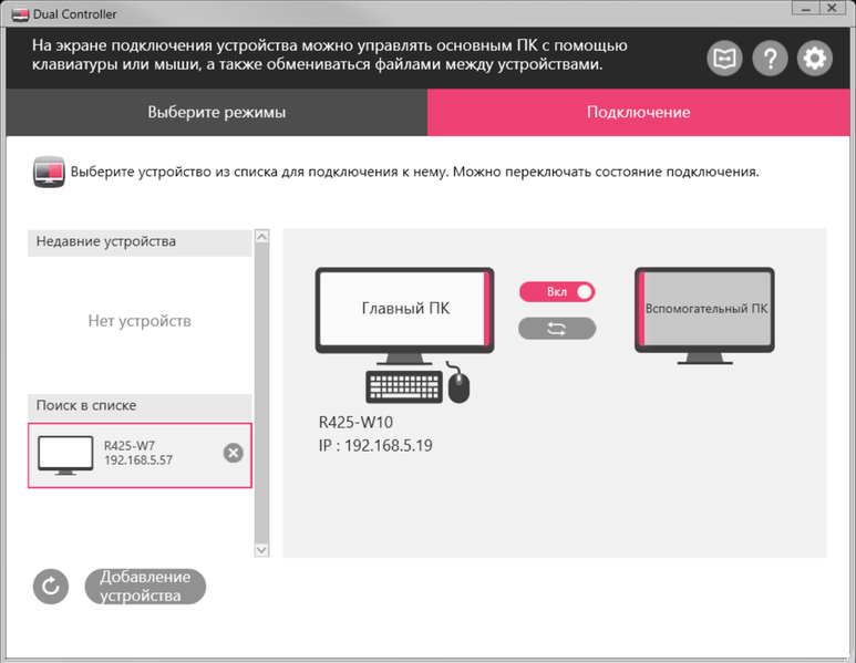Также есть возможность установить и использовать программу Dual Controller. С ее помощью двумя компьютерами, находящимися в одной сети, можно управлять одним комплектом мыши и клавиатуры, и легко копировать файлы с одного ПК на другой, при этом вывод изображения от обоих ПК может быть на один монитор в режиме PBP или на два разных. Курсор мыши просто переходит с экрана одного ПК на другой как в режиме двух рабочих столов, а ввод с клавиатуры идет на тот ПК, на экране которого находится в данный момент курсор. На обоих ПК должна быть запущена программа Dual Controller, один нужно выбрать Главным, второй — Вспомогательным.