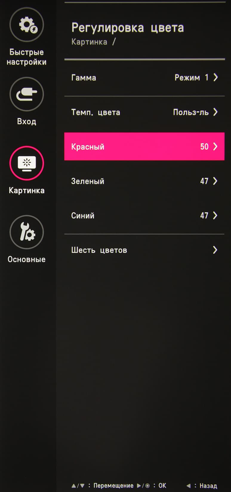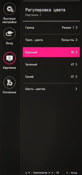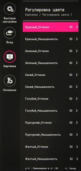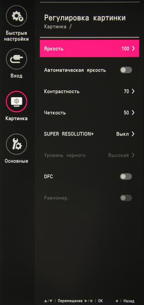 В случае сигнала HDR доступны только четыре профиля. Присутствуют стандартные настройки Яркость, Контрастность и Четкость. Есть функция улучшения изображения с низким разрешением Super Resolution+. Можно включить режим с автоматической подстройкой яркости под уровень освещенности окружающего пространства и режим выравнивания яркости и оттенка по площади отображения. В списке выбирается профиль гамма-коррекции, а цветовой баланс корректируется выбором одного из трех профилей цветовой температуры, смещением ползунка на требуемое значение цветовой температуры или ручной регулировкой интенсивности трех цветов, а также коррекцией оттенка и насыщенности шести цветов.