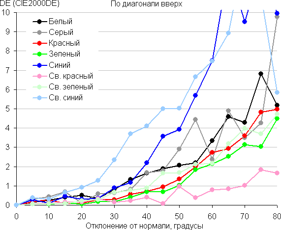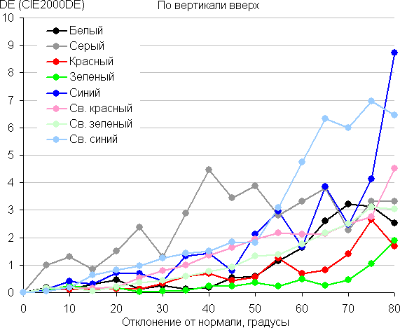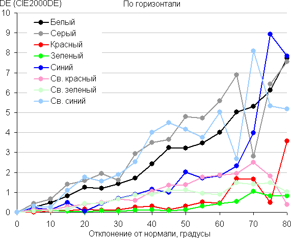 Для количественной характеристики изменения цветопередачи мы провели колориметрические измерения для белого, серого (127, 127, 127), красного, зеленого и синего, а также светло-красного, светло-зеленого и светло-синего полей во весь экран с использованием установки, подобной той, что применялась в предыдущем тесте. Измерения проводились в диапазоне углов от 0° (датчик направлен перпендикулярно к экрану) до 80° с шагом в 5°. Полученные значения интенсивностей были пересчитаны в ΔE относительно замера каждого поля при перпендикулярном положении датчика относительно экрана. Результаты представлены ниже: