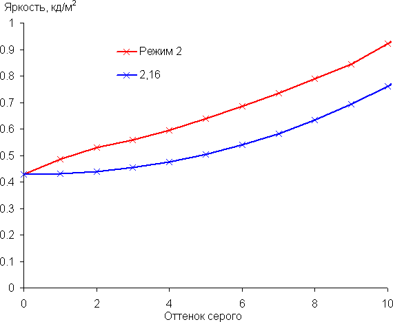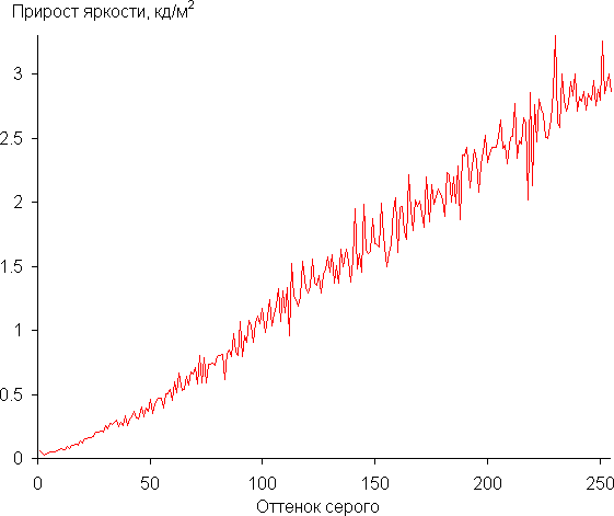 Отметим, что настройку Контрастность мы уменьшили до 60 (по умолчанию 70), так как при превышении этого значения наблюдался существенный перегиб в светлой части гамма-кривой и искажение оттенка белого. Реальная гамма-кривая ближе всего к стандартной при выборе Режим 2, поэтому далее мы измерили яркость 256 оттенков серого (от 0, 0, 0 до 255, 255, 255) при этом значении. График ниже показывает прирост (не абсолютное значение!) яркости между соседними полутонами: