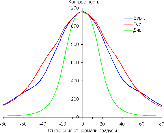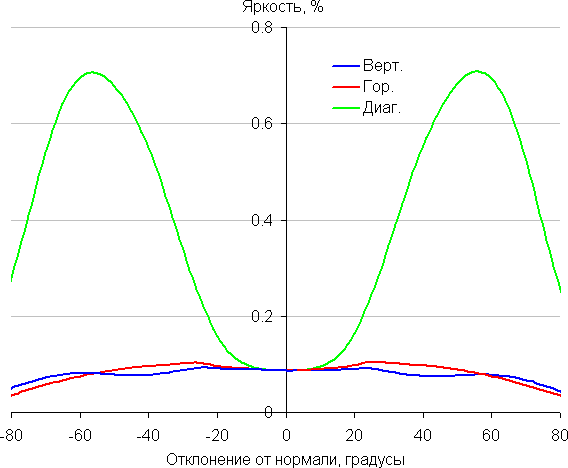 Отметим плавное уменьшение яркости при отклонении от перпендикуляра к экрану в горизонтальном направлении, при этом графики не пересекаются во всем диапазоне измеряемых углов. Чуть быстрее падает яркость при отклонении в вертикальном направлении. При отклонении в диагональном направлении поведение яркости оттенков имеет промежуточный характер между вертикальным и горизонтальным направлениями, за исключением яркости черного поля, которая начинает резко возрастать уже при 20°-30° отклонения от перпендикуляра к экрану. Если сидеть от экрана на расстоянии 50-60 см, то черное поле по углам будет заметно светлее, чем в центре. Контрастность в диапазоне углов ±82° в случае отклонения по диагонали приближается к отметке 10:1, но не опускается ниже.