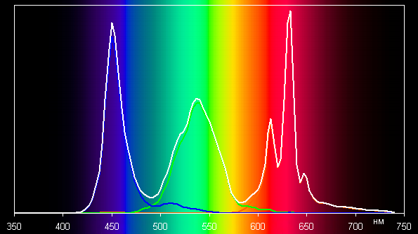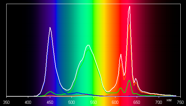 Ниже приведен спектр для белого поля (белая линия), наложенный на спектры красного, зеленого и синего полей (линии соответствующих цветов), когда нет корректировки цветового охвата (или она минимальная):
