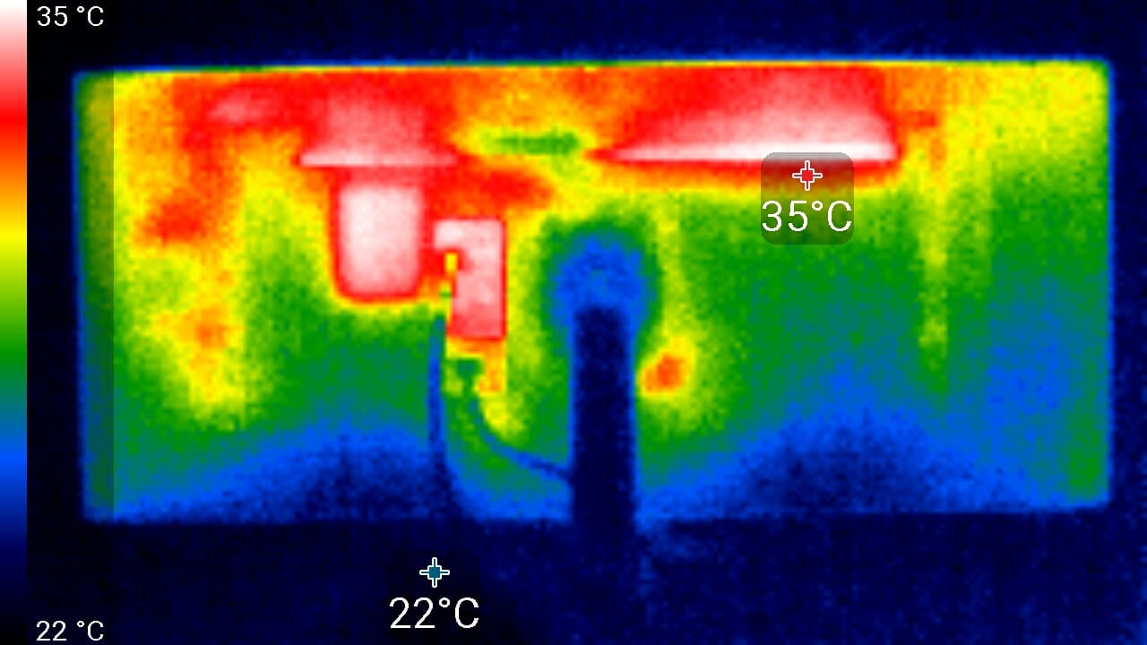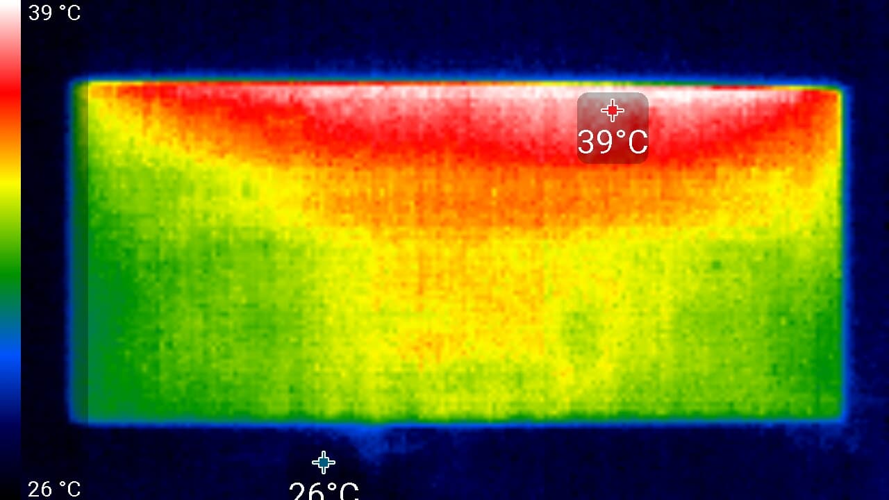 Спереди в верхней части экрана была зафиксирована температура в 39 °C — видимо, там находится светодиодная линейка подсветки экрана. Сзади локально температура достигает 35 °C — верхняя вентиляционная решетка.