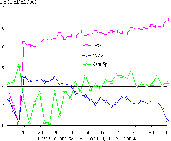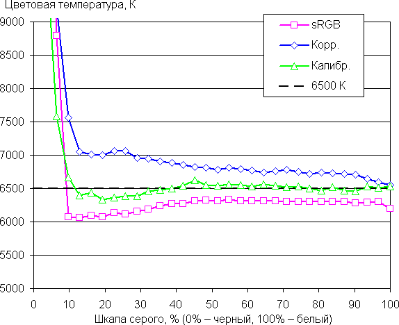 Самый близкий к черному диапазон можно не учитывать, так как в нем цветопередача не так важна, а погрешность измерения цветовых характеристик высокая. По потребительским критериям встроенный заводской профиль sRGB достаточно хорош. С профессиональной точки зрения ΔE в нем все же высоковата. Калибровка с помощью True Color Pro существенно уменьшила ΔE и приблизила цветовую температуру к стандартным 6500 К почти на всей шкале серого. Ручная коррекция позволила получить хорошую точку белого, но с ростом темноты оттенка показатели ухудшаются. Возможно, в случае профессионального использования лучшим вариантом будет аппаратная калибровка с помощью True Color Pro.