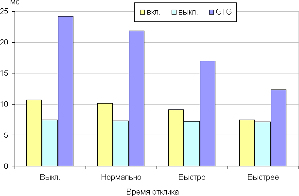 Время отклика зависит от значения одноименной настройки, которая управляет разгоном матрицы. Ступени регулировки четыре. График ниже показывает, как меняется время включения и выключения при переходе черный-белый-черный (столбики «вкл.» и «выкл.»), а также среднее суммарное время для переходов между полутонами (столбики GTG):