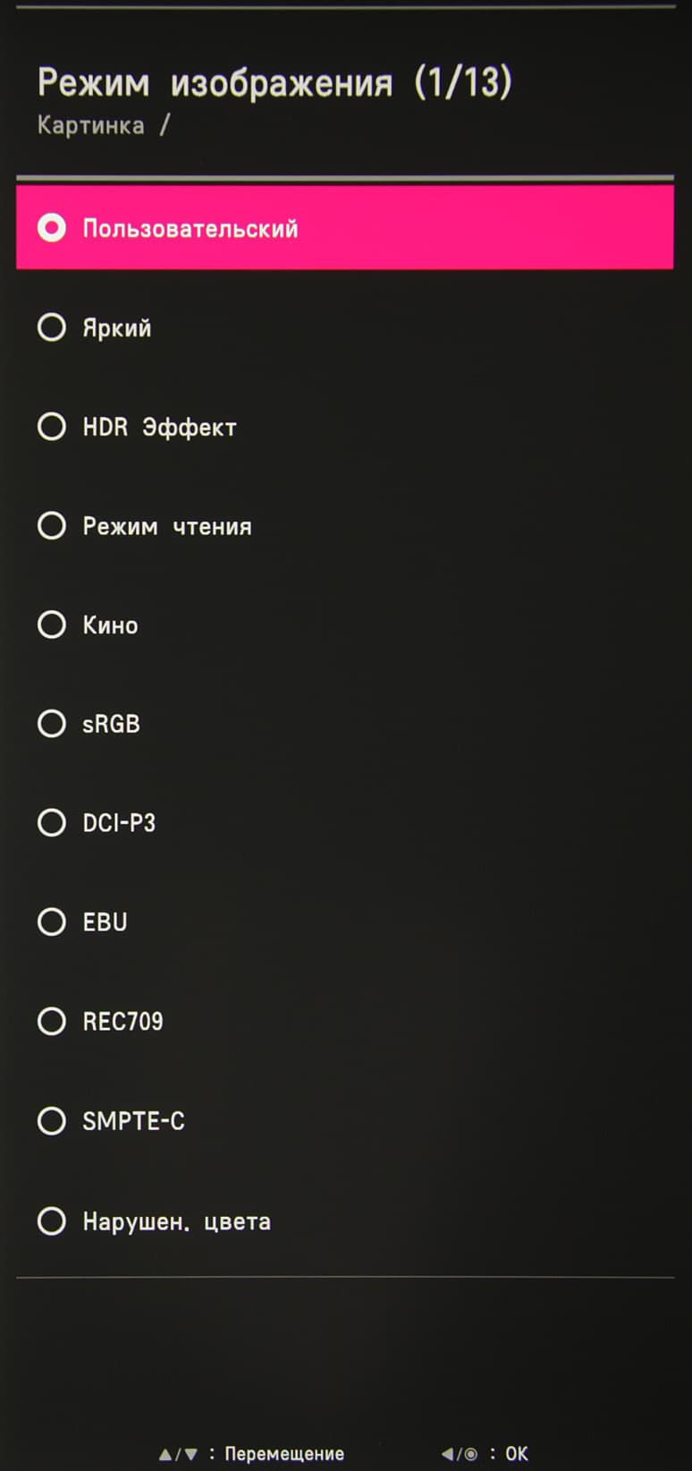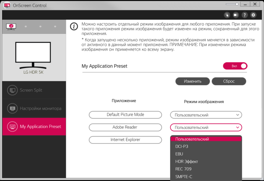Есть несколько предустановленных профилей (список Режим изображения) с заданными значениями настроек изображения, пользовательский, в котором доступно большинство настроек и два профиля для хранения аппаратных калибровок.