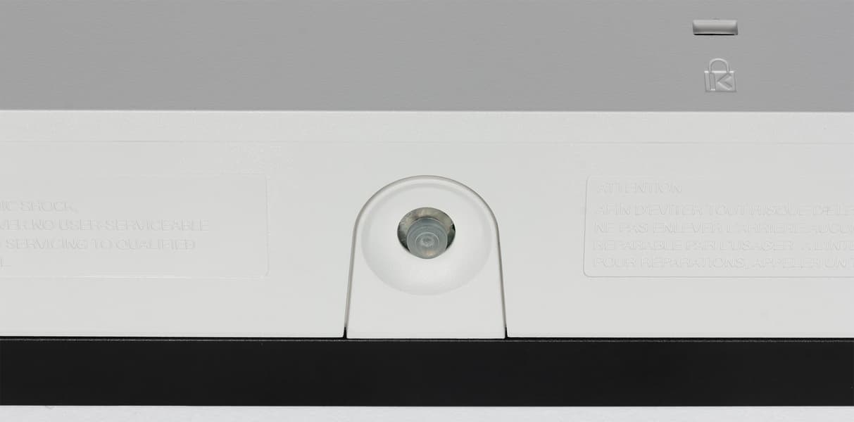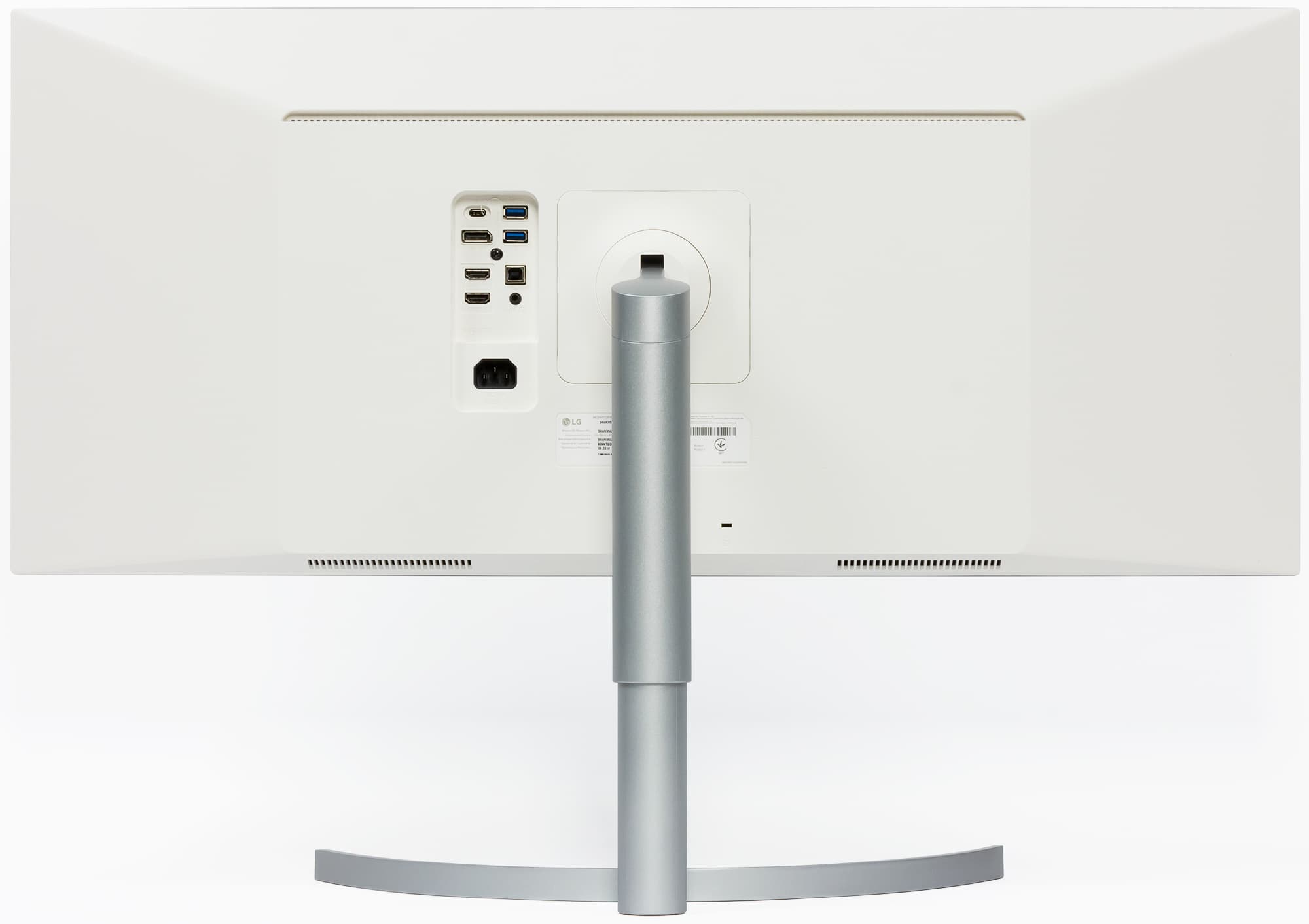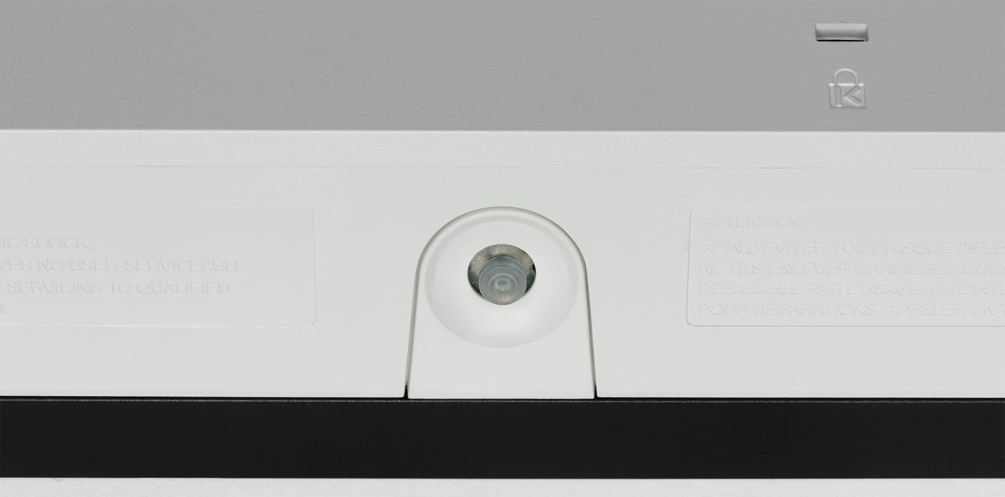 На нижнем торце блока экрана есть две разнесенные вентиляционные решетки, за которыми можно рассмотреть по два громкоговорителя с круглыми диффузором, один побольше, второй поменьше. Громкоговорители установлены в боксы. Еще одна вентиляционная решетка — на задней панели выше. Разъем питания и все интерфейсные разъемы размещены в неглубокой нише на задней панели и ориентированы назад. Так же на задней панели можно обнаружить разъем для кенсингтонского замка.
