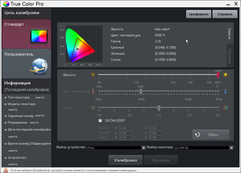 К сожалению, при выборе предустановленных профилей настройки, корректирующие цветовой баланс, недоступны. В итоге просто не существует варианта, когда можно одновременно выбрать нужный охват и скорректировать цветовой баланс. Выходом из этой странной ситуации может быть использование сторонних средств для профилирования и/или выполнения калибровки. Впрочем, производитель предлагает свой вариант в виде программы True Color Pro, предназначенной для выполнения аппаратной калибровки монитора с использованием распространенных моделей калибраторов. В этой программе в качестве целевых параметров можно выставлять охват (координаты первичных цветов), яркость, цветовую температуру и показатель кривой гамма-коррекции.