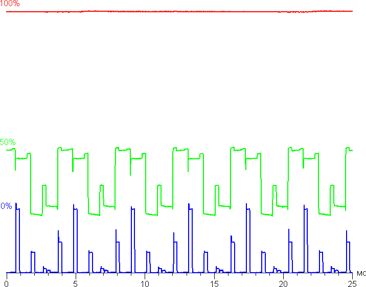 Яркость монитора меняется именно яркостью подсветки, то есть без ущерба для качества изображения (сохраняется контрастность и количество различимых градаций) яркость монитора можно менять в очень широких пределах, что позволяет с комфортом работать и смотреть фильмы как в освещенном, так и в темном помещении. На любом уровне яркости мерцания глазом не видно, по крайне мере, при обычной работе за монитором, но тест на стробоскопический эффект выявляет, что какая-то модуляция на пониженной яркости есть. Аппаратное тестирование это подтверждает. Приведем графики зависимости яркости (вертикальная ось) от времени (горизонтальная ось) при различных значениях настройки яркости: