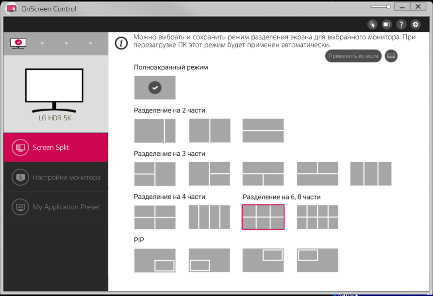 Присутствуют функция картинка-рядом-с-картинкой (PBP). В режиме PBP при разделении экрана на две части по горизонтали (на равные половины или на 3:1) поддерживается вывод с сохранением исходного соотношения сторон или с заполнением обоих половинок экрана.