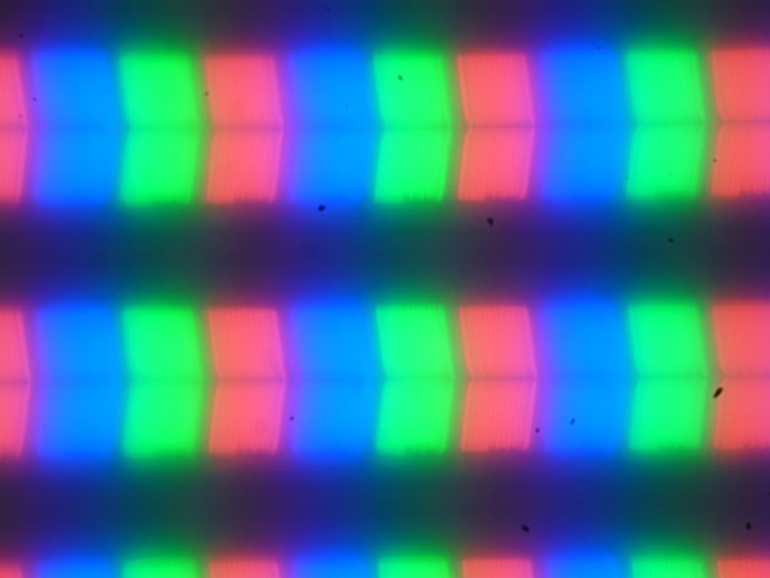 Из-за матовой поверхности экрана четкого изображения пикселей получить не удалось (черные точки — это пыль на матрице фотоаппарата), однако характерная для IPS структура субпикселей просматривается:
