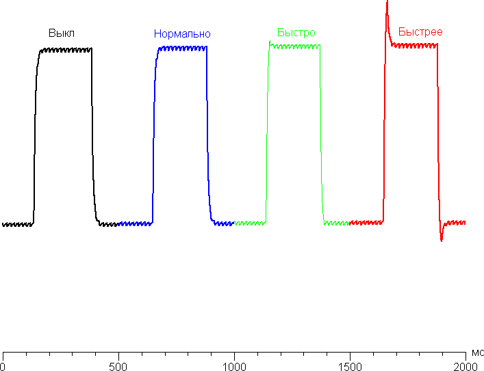 Ниже приведены графики полутонового перехода между оттенками 40% и 60% и обратно при различных значениях настройки Время отклика (по вертикали — яркость, по горизонтали — время, для наглядности графики выстроены последовательно):