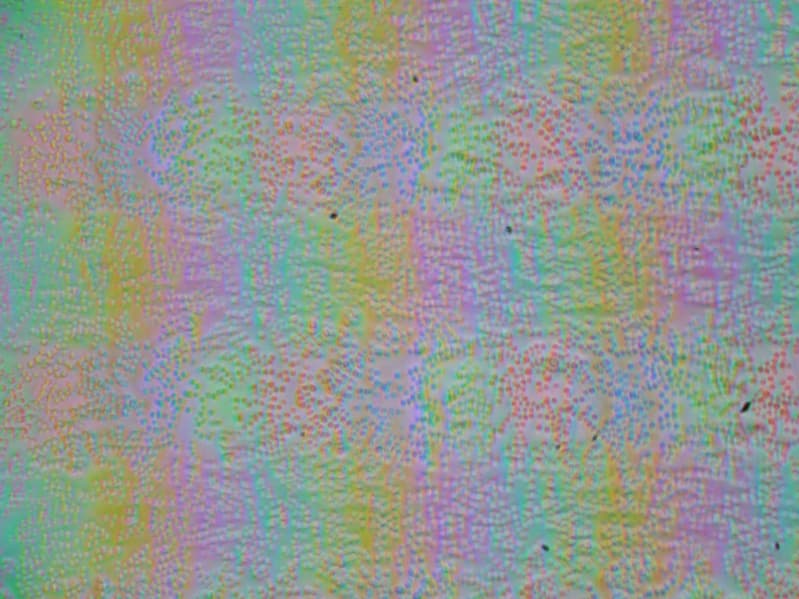Зерно этих дефектов в несколько раз меньше размеров субпикселей (масштаб этих двух фотографий одинаковый), поэтому фокусировка на микродефектах и «перескок» фокуса по субпикселям при изменении угла зрения выражены слабо, из-за этого практически нет и «кристаллического» эффекта.