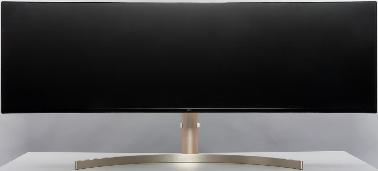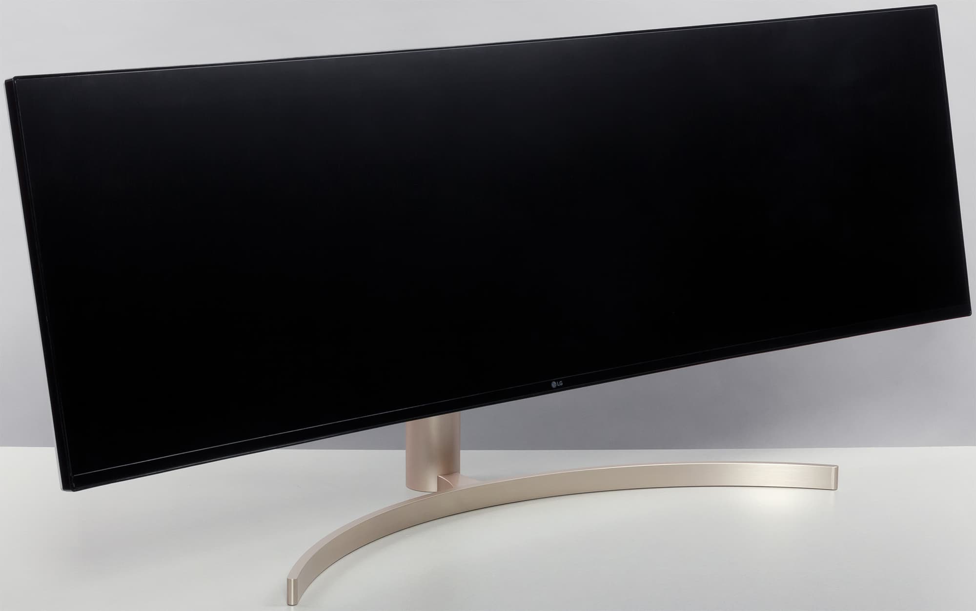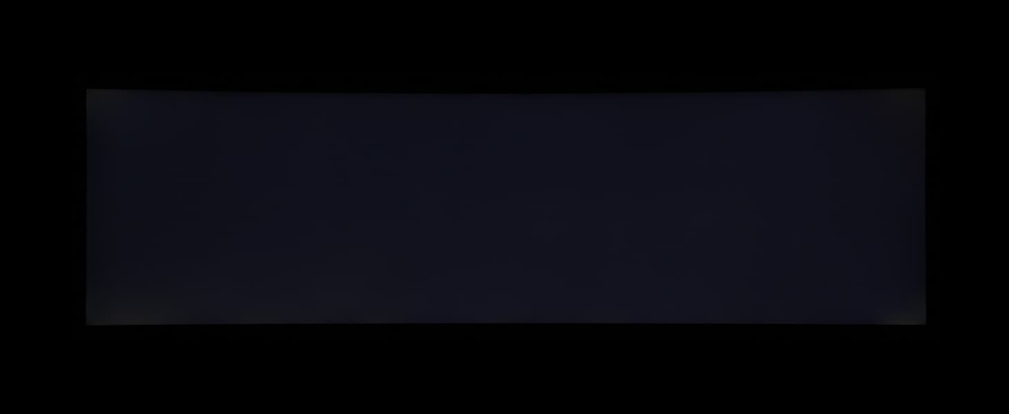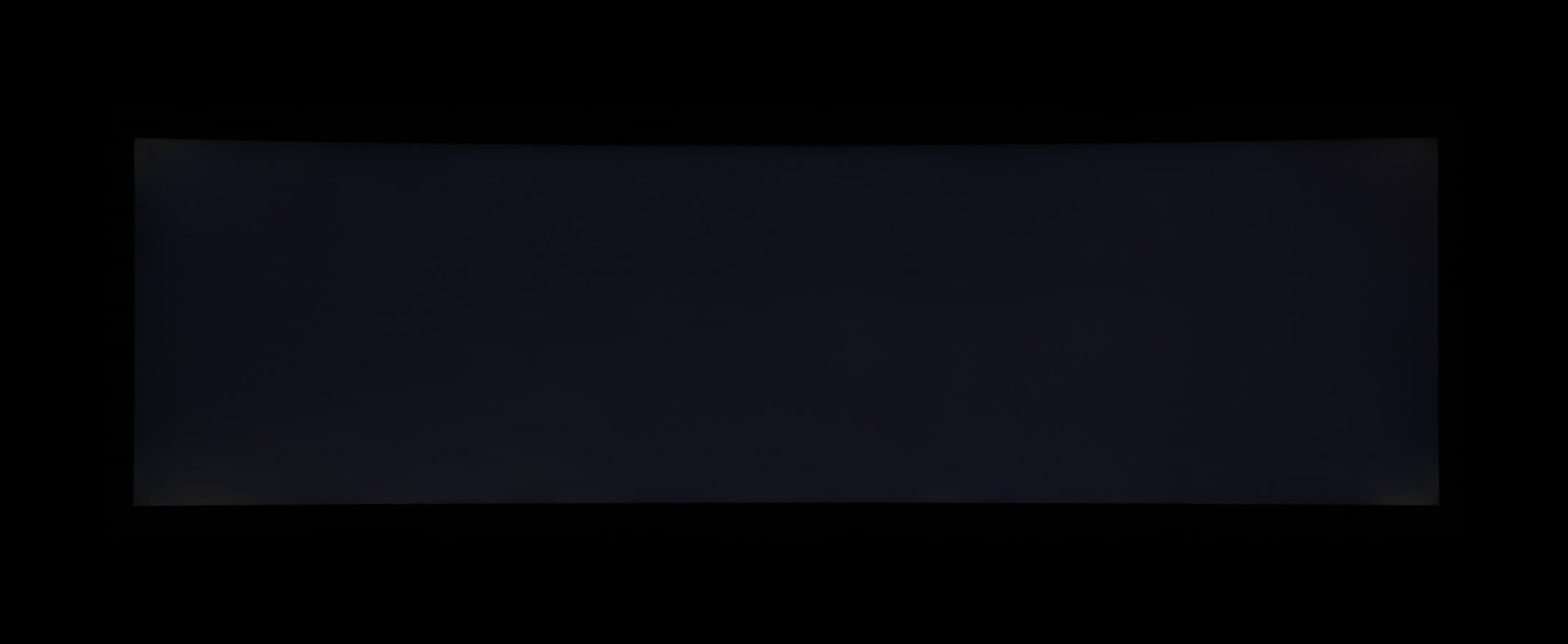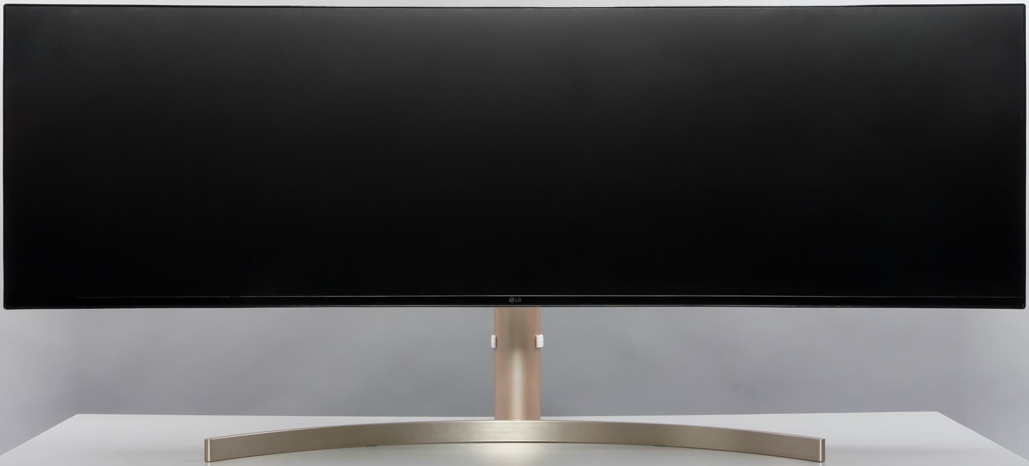 Плоскость экрана выражено изогнута по цилиндру так, что правый и левый край выдвинуты вперед. По отражению в экране видно, что изгиб более-менее равномерный на большей площади, его радиус составляет порядка 4 метров, и только по бокам в вертикальной области около 4-5 см экран скорее плоский. Фронтальная поверхность экрана монолитная черная полуматовая (зеркальность отчасти присутствует), она ограничена снизу относительно узкой стальной планкой с полуматовым черным покрытием, а по периметру — узкой окантовкой из черного пластика с зеркально-гладкой поверхностью.