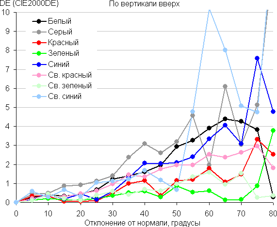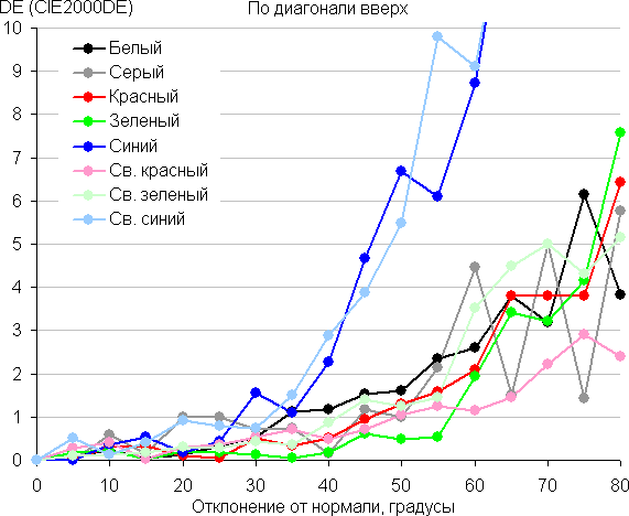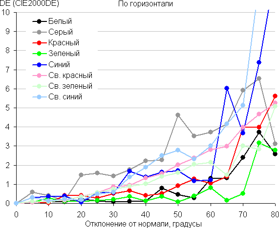 Для количественной характеристики изменения цветопередачи мы провели колориметрические измерения для белого, серого (127, 127, 127), красного, зеленого и синего, а также светло-красного, светло-зеленого и светло-синего полей во весь экран с использованием установки, подобной той, что применялась в предыдущем тесте. Измерения проводились в диапазоне углов от 0° (датчик направлен перпендикулярно к экрану) до 80° с шагом в 5°. Полученные значения интенсивностей были пересчитаны в ΔE относительно замера каждого поля при перпендикулярном положении датчика относительно экрана. Результаты представлены ниже: