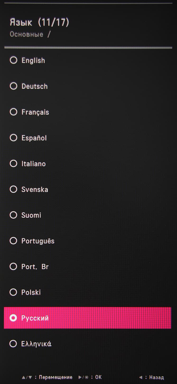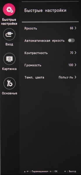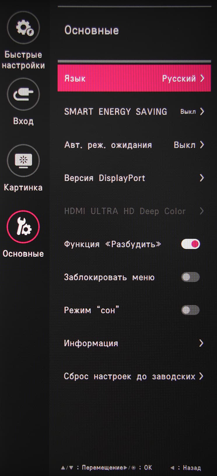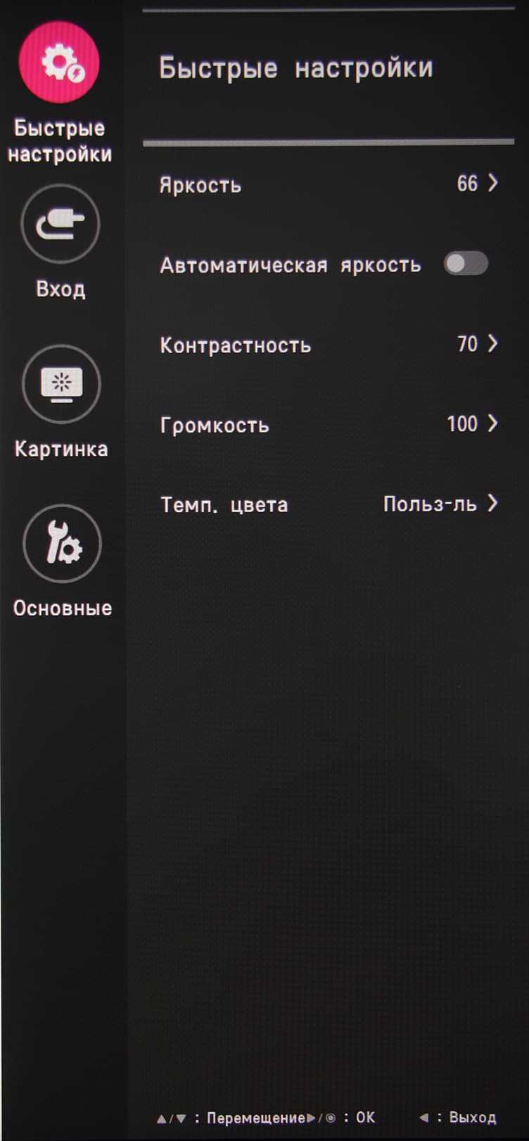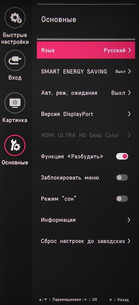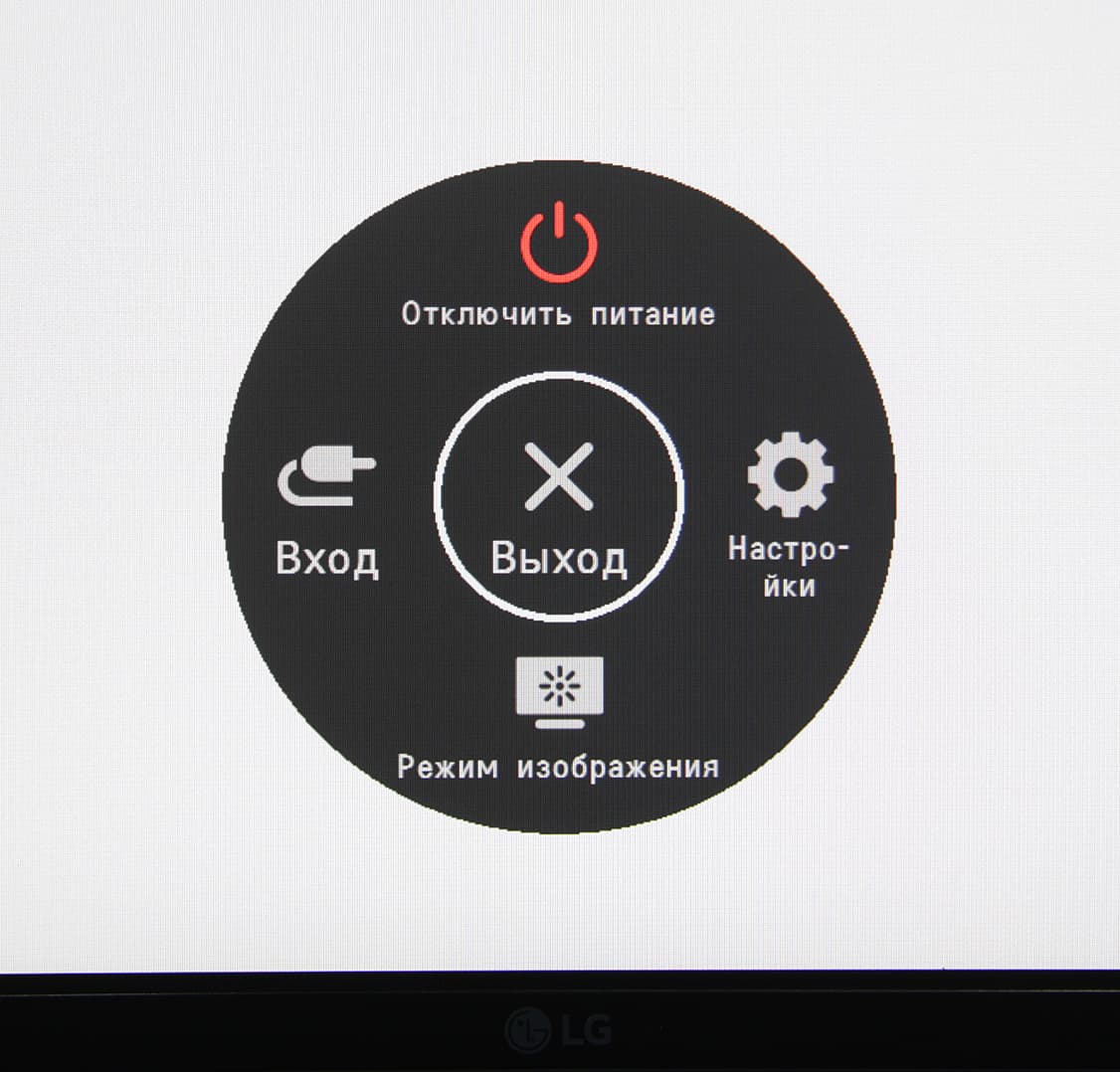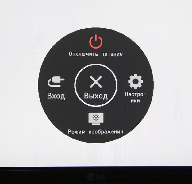Длительное нажатие выключает монитор. При включении монитора раздается негромкий звуковой сигнал (его можно отключить в настройках). Из стартового меню можно выйти, перейти к выбору входа, к основному меню, в список выбора режима (профиля изображения), или выключить монитор. Далее при навигации по меню в нижней его части выводится подсказка по текущим функциям джойстика. Меню занимает на экране небольшую часть площади вертикальной полосой в правой части, что, конечно, иногда слегка мешает оценке вносимых изменений.
