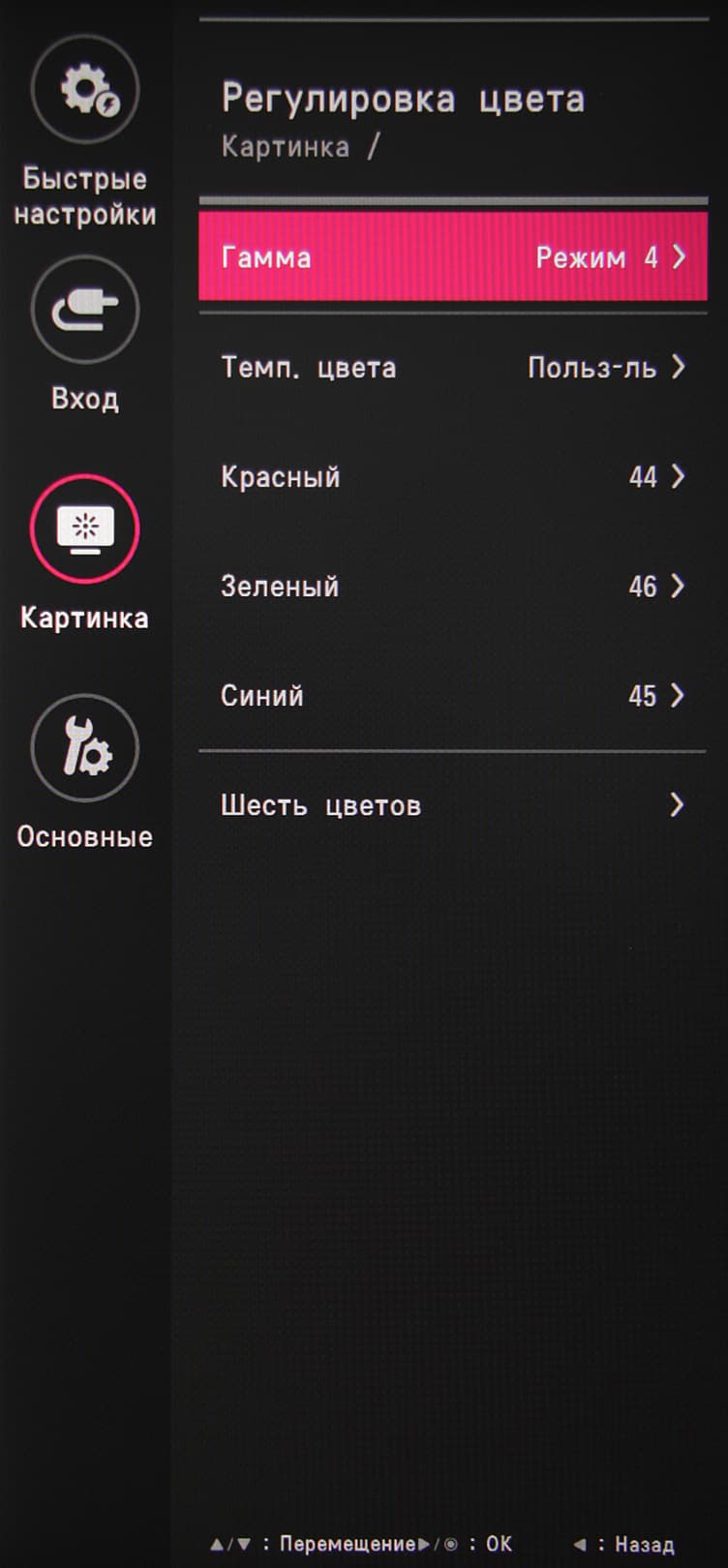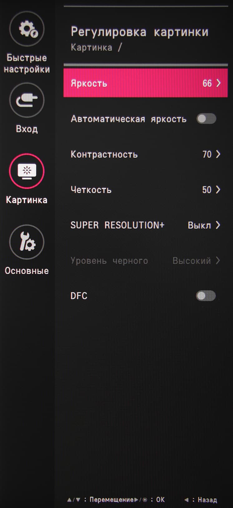 В случае сигнала HDR доступны только выбор одного из четырех профилей и регулировка яркости подсветки. Присутствуют стандартные настройки Яркость, Контрастность и Четкость. Есть функция улучшения изображения с низким разрешением Super Resolution+. Можно включить режим с автоматической подстройкой яркости под уровень освещенности окружающего пространства. В списке выбирается профиль гамма-коррекции, а цветовой баланс корректируется выбором одного из трех профилей цветовой температуры или ручной регулировкой интенсивности трех цветов, а также коррекцией оттенка и насыщенности шести цветов. Сочетания значений настроек запоминаются для каждого входа.